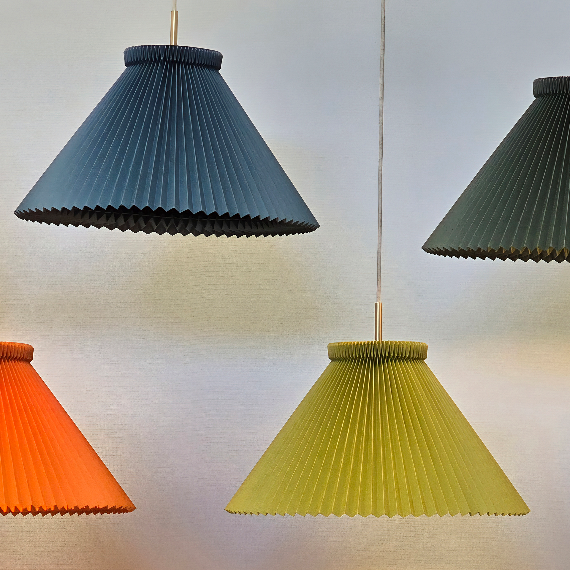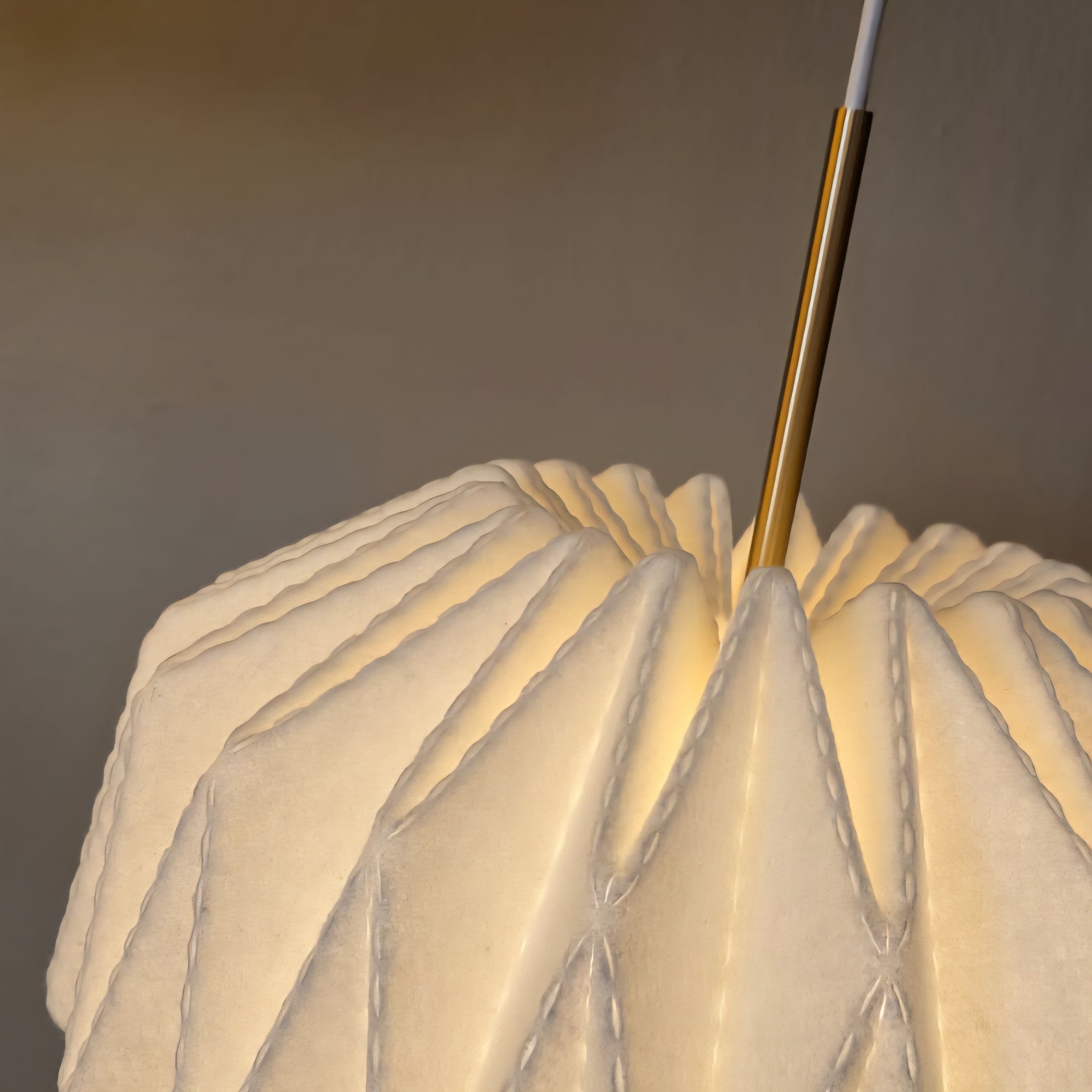 Eine neue Serie handgefalteter Filzlampen, entworfen von Philip Bro. Die Lampen spenden ein weiches, warmes Licht in Kombination mit einem effektiven, nach unten gerichteten Lichtschein – und bringen zugleich Funktionalität und ein Gefühl von dänischem Hygge in jeden Raum. Das schallabsorbierende Material und die präzisen Falten sorgen für eine markante akustische Wirkung, während die Form auch nach Berührung mühelos erhalten bleibt.