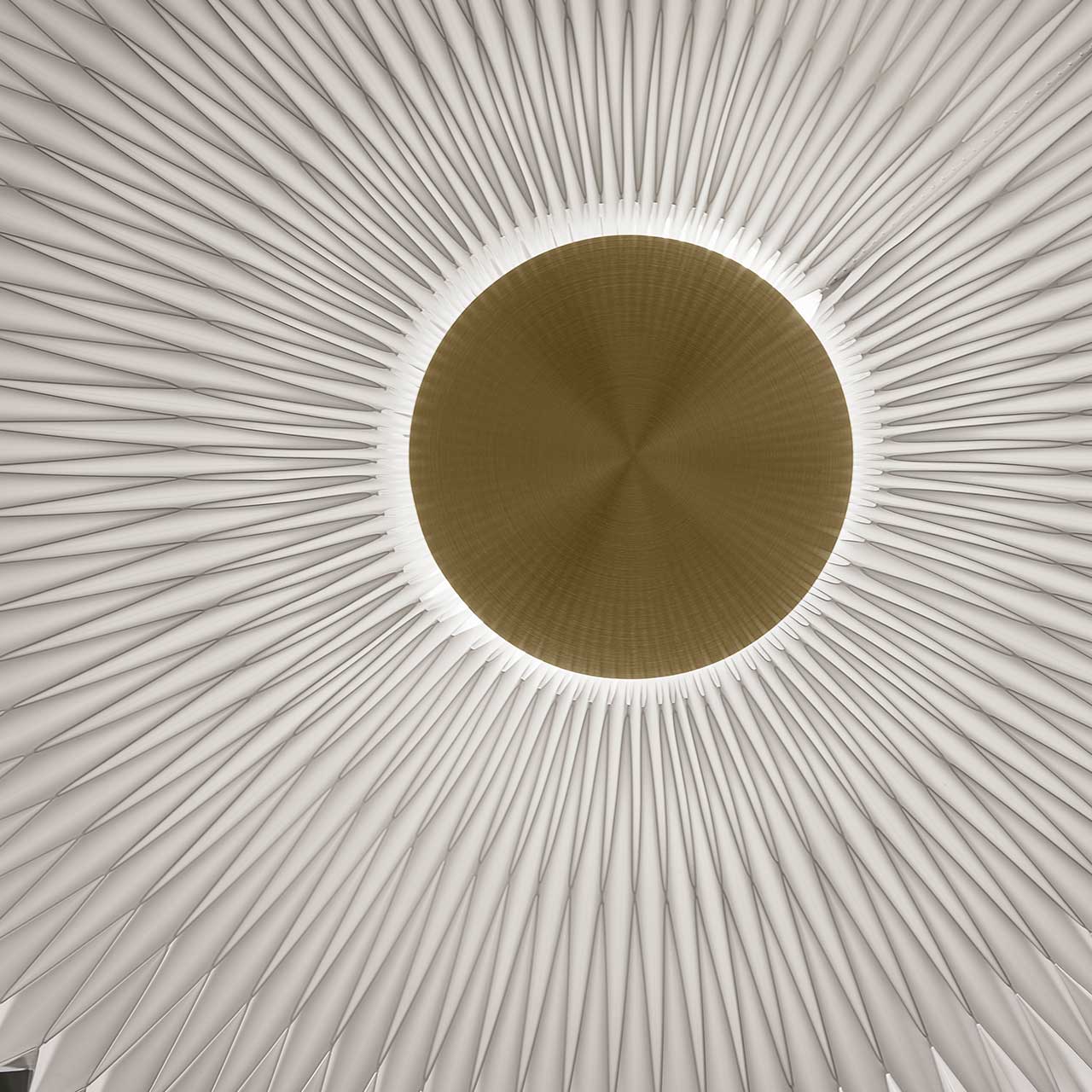 Heute gibt es die Lampe mit handgefaltetem Schirm in „Klein“ (⌀47 cm) und in „Groß“ (⌀53 cm). Sie ist oben und unten komplett mit einer polierten Stahlplatte geschlossen – und in ihrer neuesten Version, bestehen die Metallelemente aus gebürstetem Messing.
