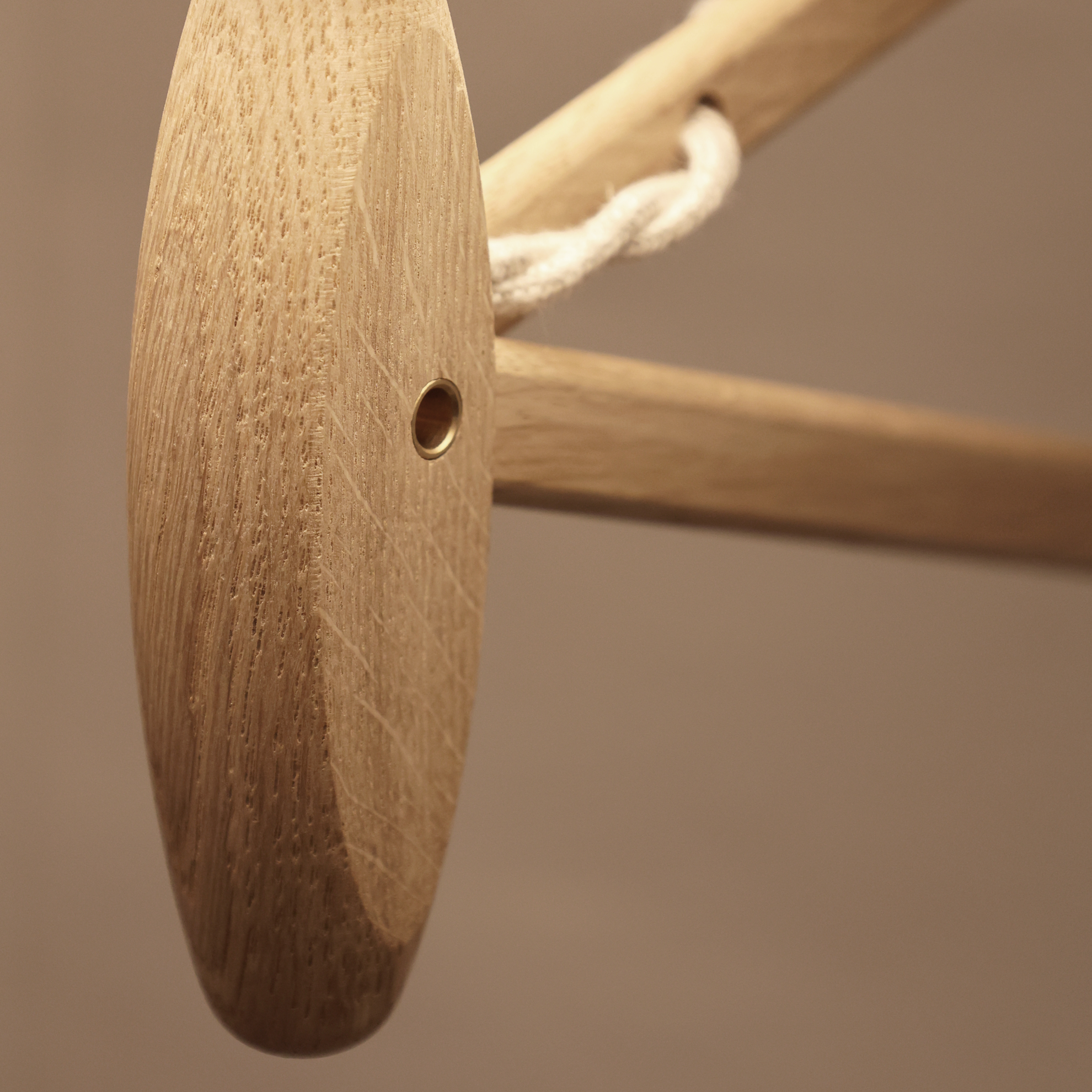 Als Hommage an dieses einzigartige und ikonische Lampendesign wurde in Zusammenarbeit mit Designer Erik Hansen eine spezielle Jubiläumsausgabe des Modells mit nach oben gerichtetem Schirm entwickelt, bei der alle feinen Details hervorgehoben werden. Sie wird mit einer Messingbuchse, geflochtenem Leinenkabel und handgefertigtem Papierschirm geliefert. Hier wurde auf jedes Detail geachtet. Das Holz ist unbehandelte oder geräucherte Eiche.