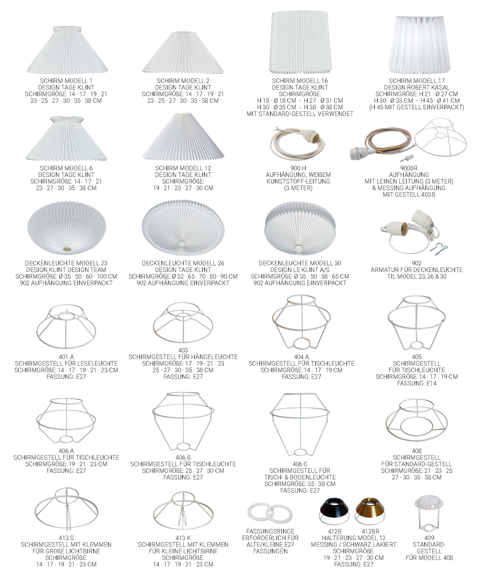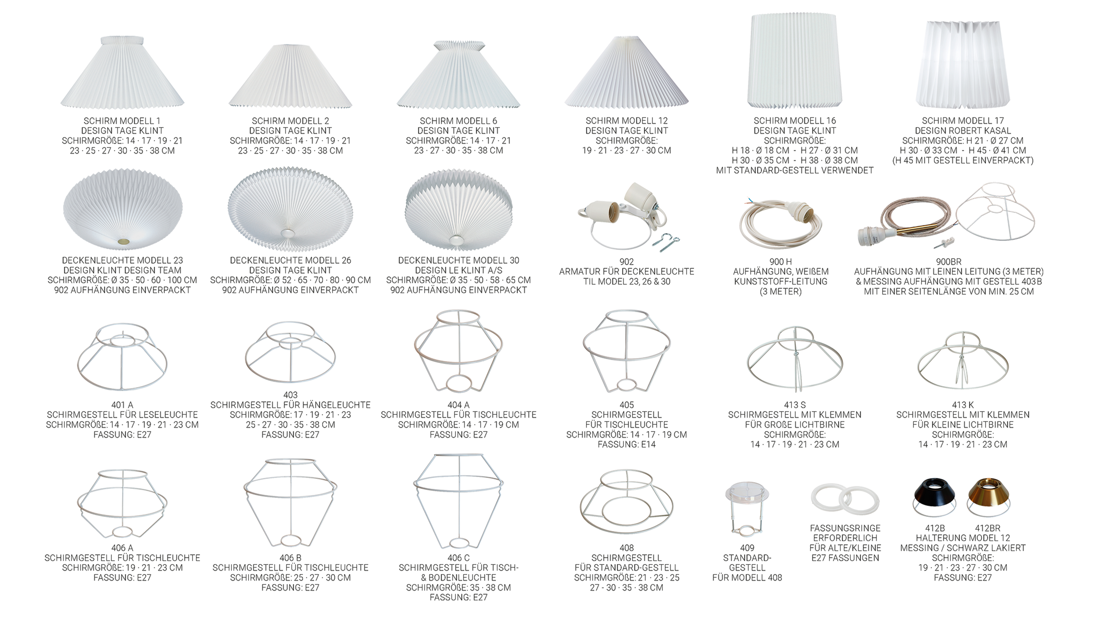 In dieser Übersicht sind unsere separaten Lampenschirme, Stative und Aufhängungen aufgeführt.
