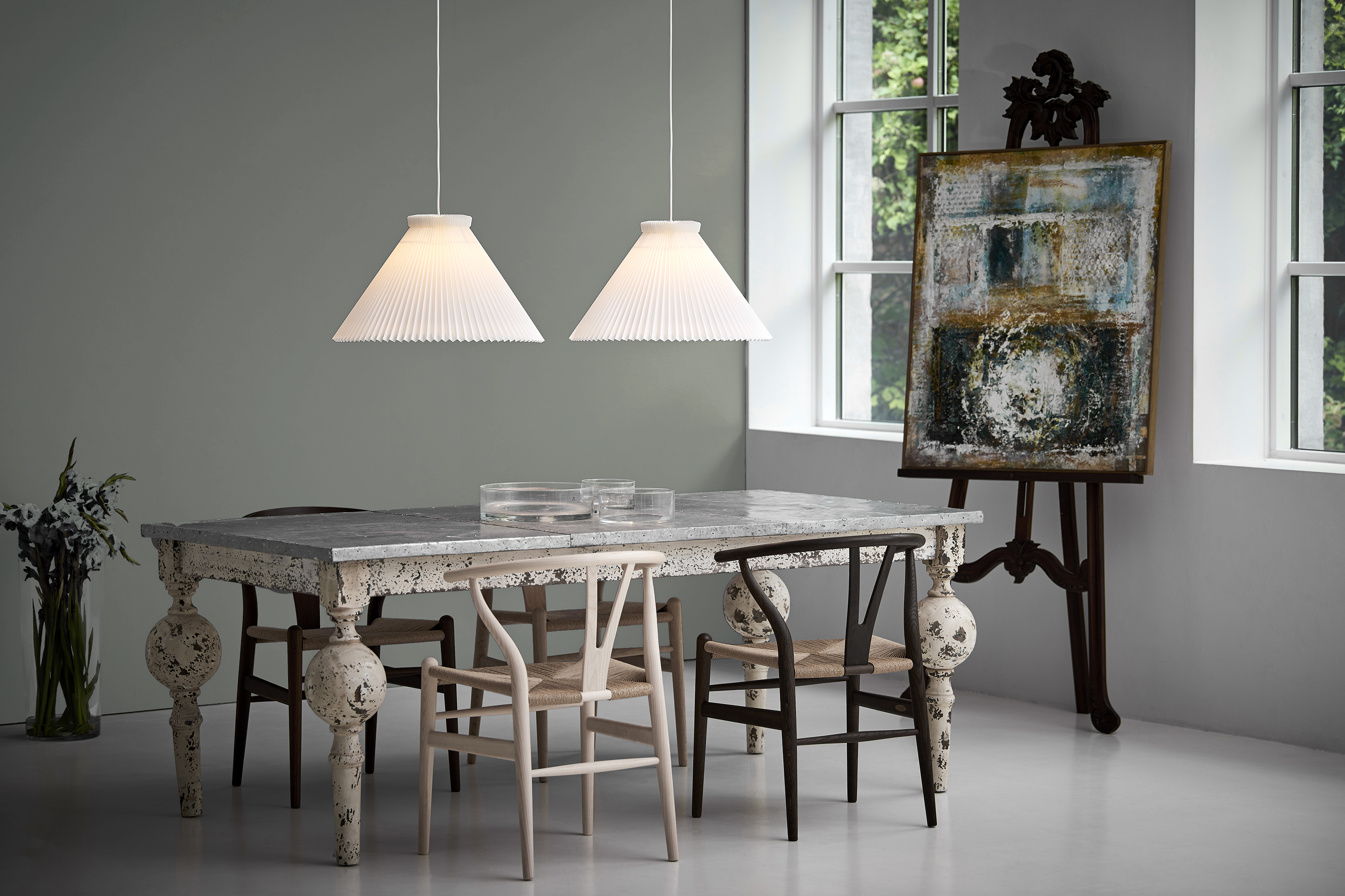 Die Reinigung der Standardlampenschirm kann auch mit handwarmen Wasser mit leichter Seifenlösung, einer weichen Bürste und Anspülen mit einer Handbrause vorgenommen werden. Beachten Sie bitte, dass Le Klint auch Lampenschirme aus Papier herstellt, die nicht gewaschen werden können.