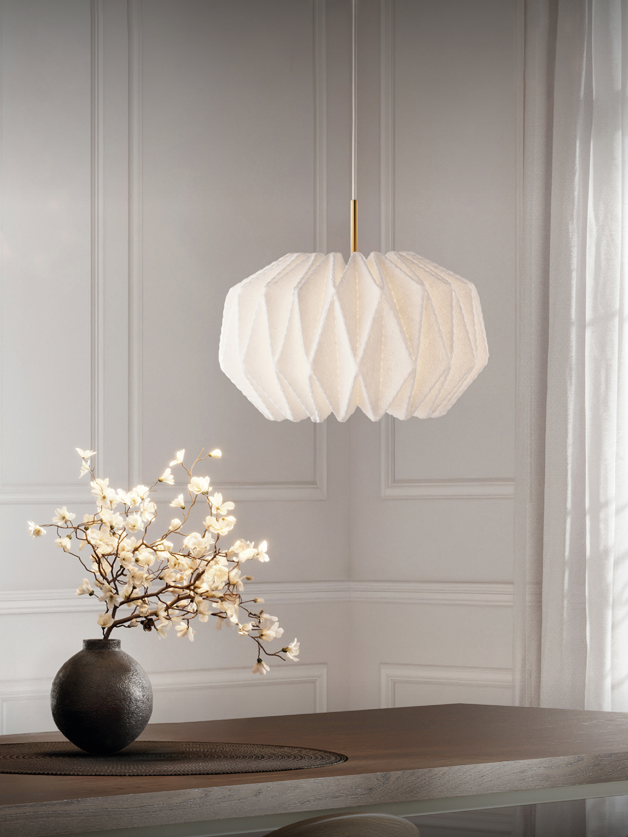 Die Pendelleuchten der Serie sind, wie bei unseren klassischen Lampen, von Hand gefaltet. Das Filzmaterial eröffnet neue Möglichkeiten: Durch die tiefen Perforationen der Lampe entsteht ein besonders sanftes Licht. Gleichzeitig erzeugt Filz generell ein warmes, goldenes Licht, das zur Schaffung von Atmosphäre und Stimmung im Raum beiträgt.