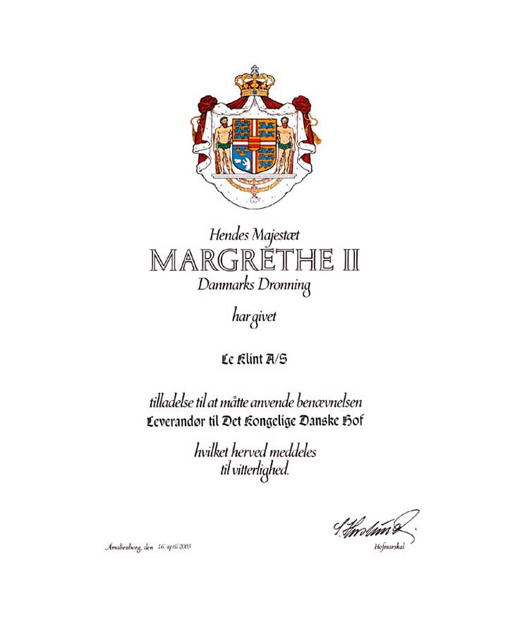 Mit Stolz nahm man daher am 16. April 2003 die Bekanntgabe der Ernennung zum königlichen Hoflieferanten entgegen. Im selben Jahr konnte Le Klint auch sein 60-jähriges Jubiläum feiern.